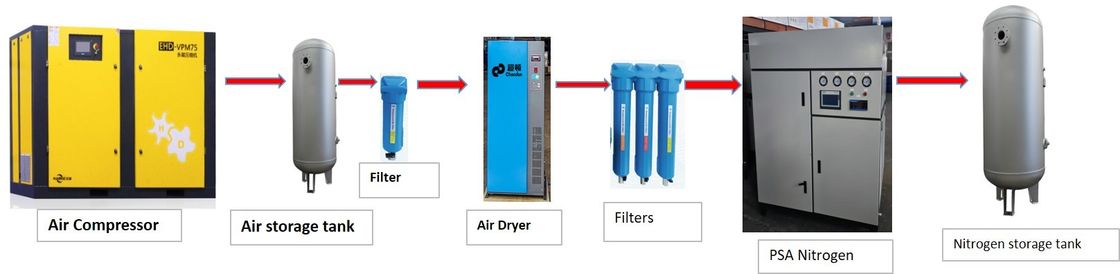 PSA 질소 발전기의 원료는 풍부하고 쉽게 구할 수 있는 공기입니다. 발전기는 질소 분자를 공기 내의 다른 기체로부터 분리하기 위해 분자 필을 사용합니다.이 시스템은 고순도 질소를 생산하기 위해 고순도 수준 99.99%